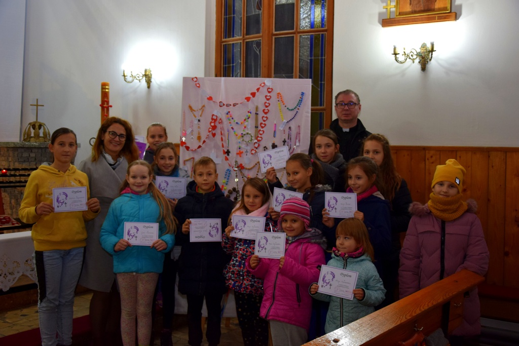 22 dzieci otrzymało nagrody pocieszenia i dyplomy oraz różańce na rękę, którymi obdarowane zostały także wszystkie inne dzieci będące w kościele.