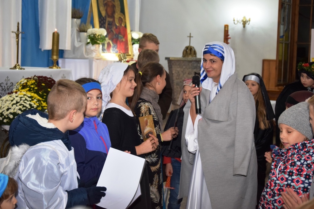 Po odmówieniu litanii i odśpiewaniu piosenki z repertuaru „Arki Noego” dzieci szukały w kościele świętych, których bardzo dobrze pani katechetka ukryła w konfesjonale, między ławkami i na ołtarzu. Dzięki tej zabawie najmłodsi mogli usłyszeć ciekawostki o postaciach, za które się tego dnia przebrały. Na wspólnym pamiątkowym zdjęciu zrobionym przez pana Rafała można dostrzec: św. Jana Pawła II, św. Teresę, św. Marię, św. Faustynę, św. Franciszka, św. Jadwigę, św. Mikołaja czy św. Antoniego.