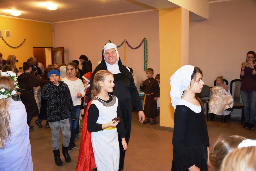 W dobrych nastrojach, trochę przemarznięci, wszyscy przekroczyli próg salki katechetycznej, gdzie czekały słodkości przygotowane przez rodziców. I tu nastąpiła najgłośniejsza część spotkania: konkursy z nagrodami i tańce…, a nad całością czuwała pani Ania. Święci pogubili aureole, a ich buzie umazały się czekoladą, więc bal chyba można uznać za udany.