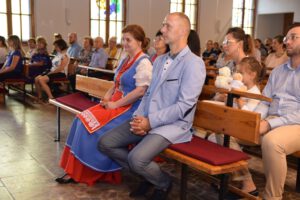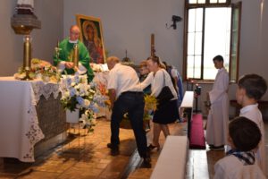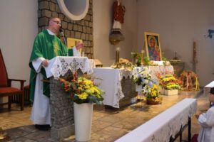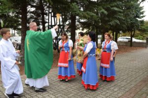 Podczas Mszy św. dożynkowej w niedzielę 21 sierpnia dziękowaliśmy za tegoroczne plony i szczęśliwe zakończenie żniw. Eucharystii przewodniczył ks. Maciej Andrzejewski, który poświęcił wieniec dożynkowy, chleb i kosz darów z pól i sadów. Na zakończenie Mszy św. słowo do zgromadzonych w kościele mieszkańców naszej parafii skierował zastępca wójta Gminy Dobrcz pan Sebastian Horodecki. Po uroczystości odbył się słodki poczęstunek w kawiarence.